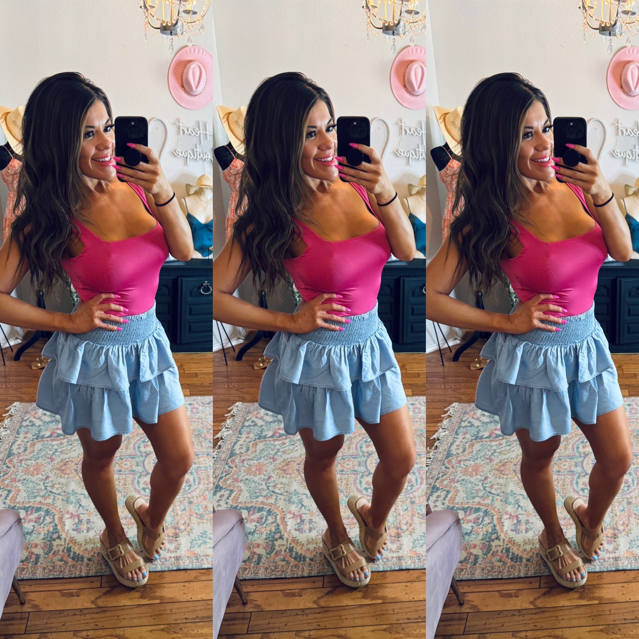 This shirred waist mini skirt will add some fun to your style. The lightweight fabric drapes beautifully and the elastic waist gives some stretch.