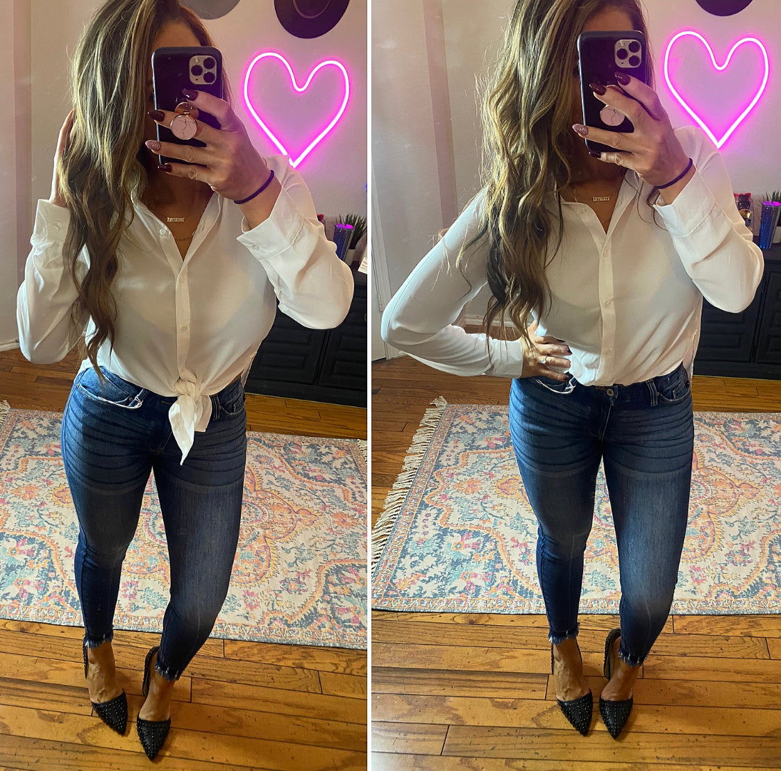 This button down white chiffon blouse is chic and classy. It's a top that can be versatile by layering, knotting, or spicing it up with a bralette underneath.