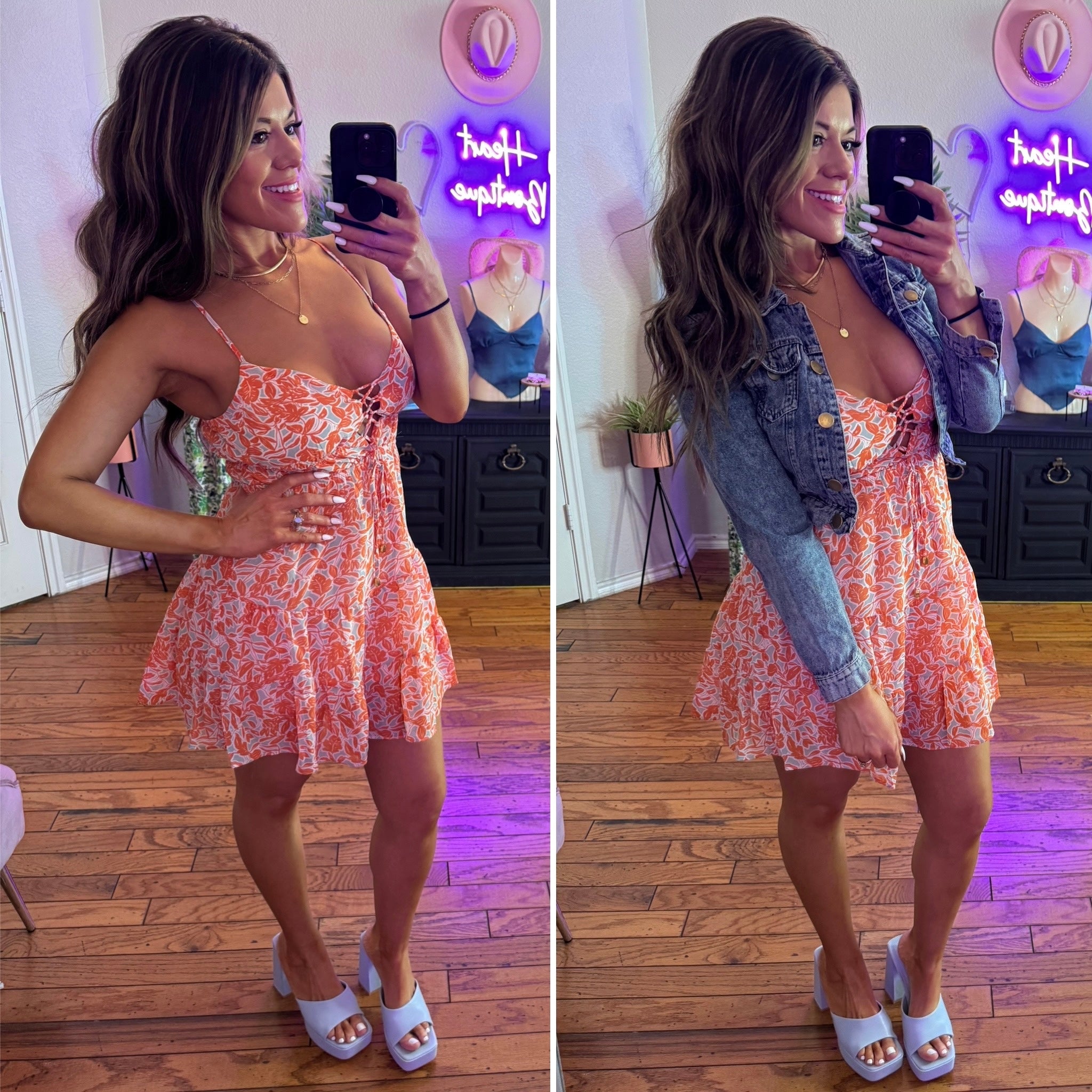 Summer Nights is a beautiful mint and orange floral dress. This summer dress laces up in the front to give it the perfect detailing and ruched to give some flattery and stretch. The straps are adjustable and it is double lined.